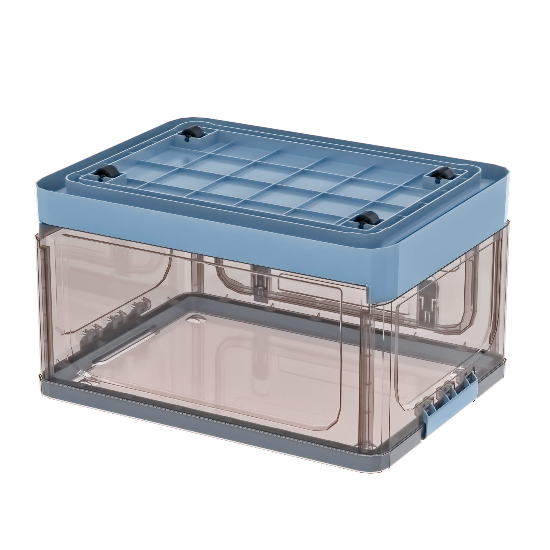 Практичный пластиковый складной ящик представляет собой идеальное сочетание дизайна и функциональности. Прозрачные стенки с коричневым оттенком позволяют легко увидеть содержимое, а глубокое синее дно придает изделию стильный и современный вид. Пластиковый контейнер идеально подходит для хранения одежды, игрушек, бытовых принадлежностей, документов и других мелочей.
