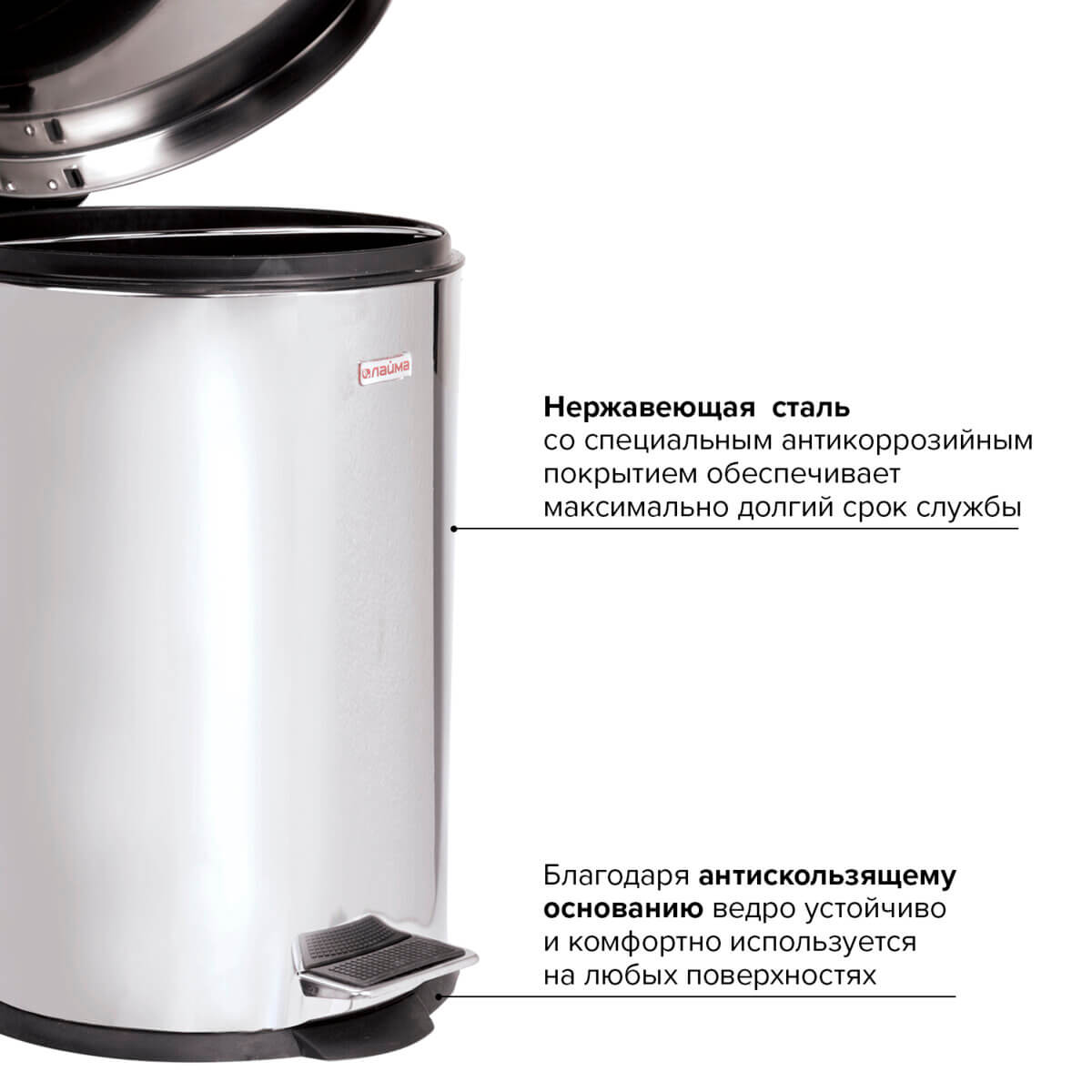 Изготовлено из нержавеющей стали с антикоррозийным покрытием, что гарантирует долгий срок службы. Антискользящее основание придает устойчивость ведру. Рекомендуемый объем мешка - 20 литров.